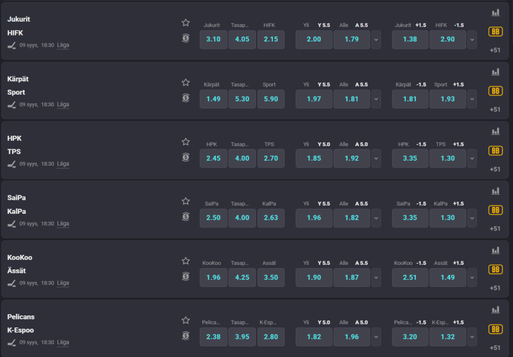 - HPK – TPS ja Pelicans – Kiekko-Espoo tarjoavat vedonlyöjille eniten pohdittavaa, sillä voimasuhteet näyttävät tasaisilta ja yllätyksille on tilaa.
