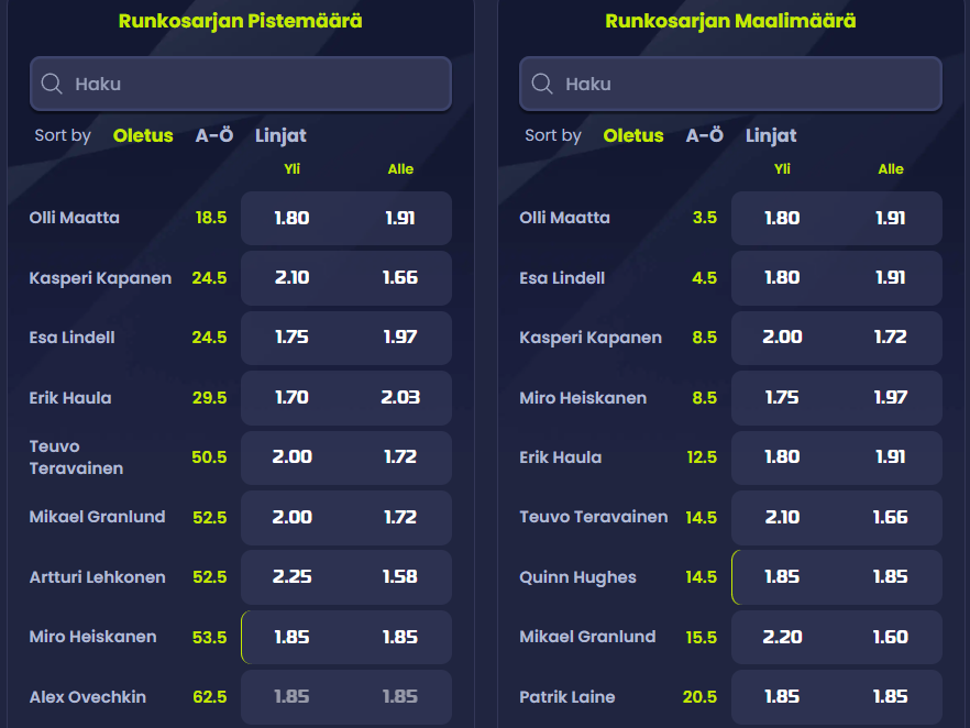 Nyt on vielä loistava aika heittää kausivedot kehiin. Luonnollisesti voit lyödä vetoa vaikkapa Vezina Trophyn voittajasta, NHL:n runkosarjan parhaasta pistemiehestä tai vaikkapa Vuoden tulokkaasta? Eri vedonlyöntisivustot tarjoavat mitä kivempia kohteita vedonlyöntiin, kannattaa käydä katsomassa mm. Coolbetin, Epicbetin ja monen muun sivuston erikoiskohteet. Tässä Epicbetin mm. suomalaispelaajien runkosarjan pistemääriä ja maalimääriä.