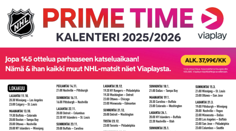 NHL:n faneille koittaa taas kissanpäivät, kun kausi alkaa ensi viikolla. Tarjolla on hurjasti otteluita ja vieläpä parhaaseen katseluaikaan. Täältä löydät NHL Prime Time Kalenteri 2025/2026 tiedot alkavalle kaudelle! Livestreamit Viaplayn kautta.